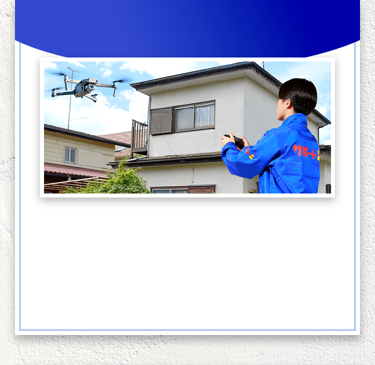 ドローンに取り付けたカメラを使用して外壁の損傷個所を調べます。人の目が直接届かない高いところを調べられるのがメリットになります。